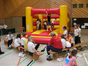Nach dem leckeren Mittagessen (Hamburger) ging es beim Völkerballspiel -Trainer gegen Jugendliche- „heiß“ zu. Trotz der Beschwörung des Trainerteams „Wir sind die Besten“ sprang für sie nur ein unentschieden heraus.