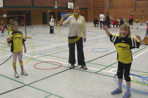 Die Referentin Silke Prante vom VfL Oldenburg stellte das Thema „Aufbau einer altersgerechten Trainingseinheit“ den 14 Teilnehmern mithilfe der E-Jugend des VfL Oldenburg sehr praxisorientiert vor.Nach einer kurzen theoretischen Einführung zeigte Silke Prante anhand vieler verschiedener Übungen, welche vielfältigen Möglichkeiten ein Trainer hat, die Grundtechniken Fangen, Werfen, Prellen mit den Kindern spielerisch zu erlernen.