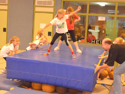 An der Rodeomatte versuchten die Kinder, durch das hin- und Herziehen der Matte, den "Reiter" zu Fall zu bringen.