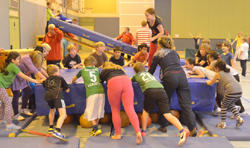 spielten Rodeo auf der Weichbodenmatte, die Tiger jonglierten mit Keulen oder Tüchern, die Wölfe fuhren mit Rollbrettern durch einen Tunnel, die Eichhörnchen maßen ihre Kräfte gegen die Hirsche beim Tauziehen, die Leoparden balancierten über einen Balancier-Rundkurs, die Nashörner versuchen sich mit Stelzen und Pedals vorwärts zu bewegen, und die Elefanten hüpften mit Hüpfbällen oder Moonhopper durch die Halle. (siehe auch anliegenden Spielplan)