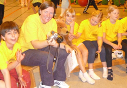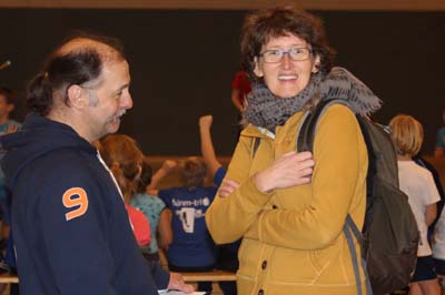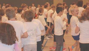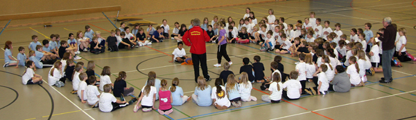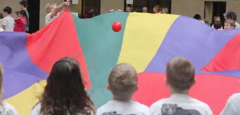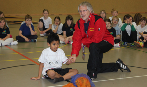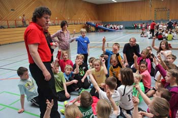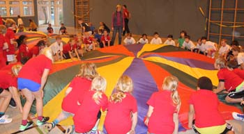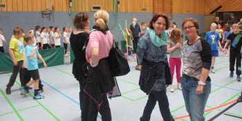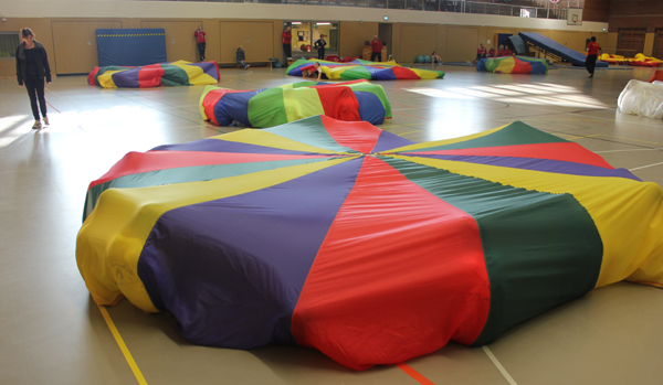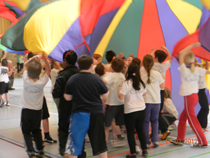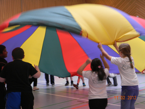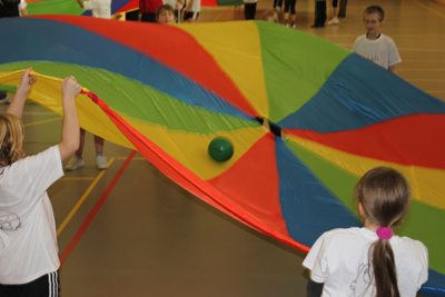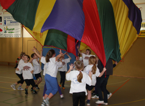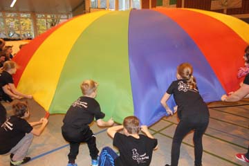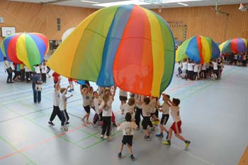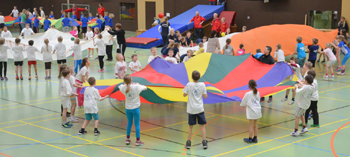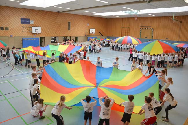 Nach der Begrüßung und Einweisung durch Jens, tanzte Willi in der Aufwärmphase mit den Schülern einen zünftigen Rock´ n Roll, wobei die Schüler schon ordentlich in Schwung kamen. Nach der ersten Spielrunde erfolgte ein Zwischenspiel mit vielen bunten Fallschirmen an denen die 413 Schüler verteilt wurden. Unter Anleitung wurden einige Übungen durchgespielt. Den Zuschauern bot sich ein farbenprächtiges Bild.