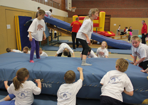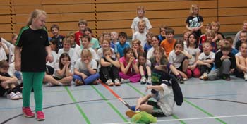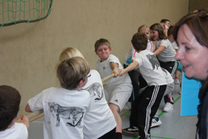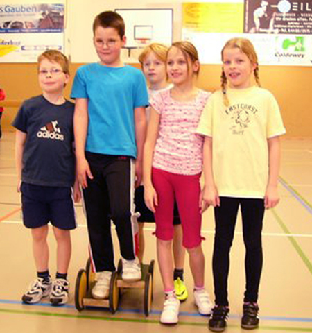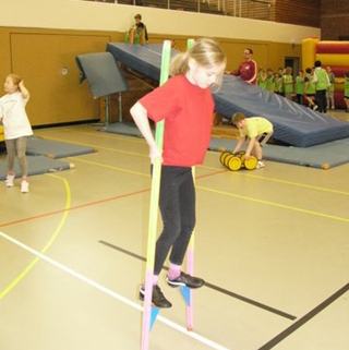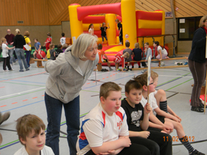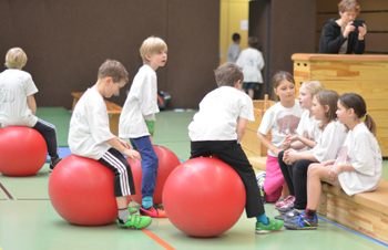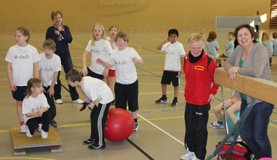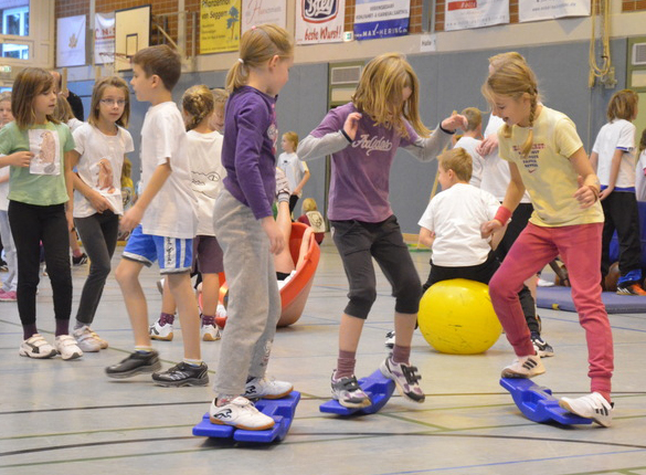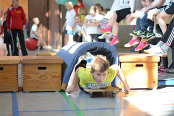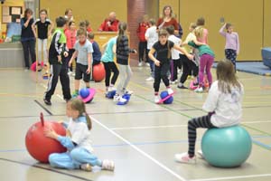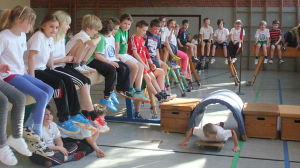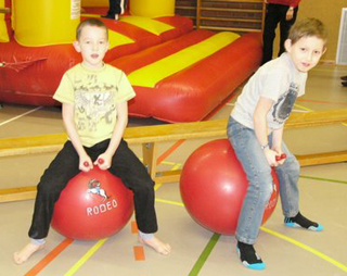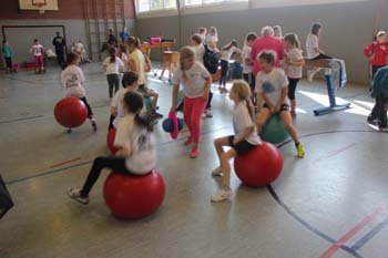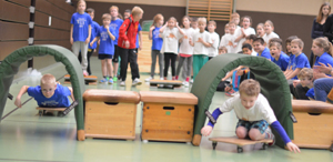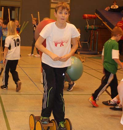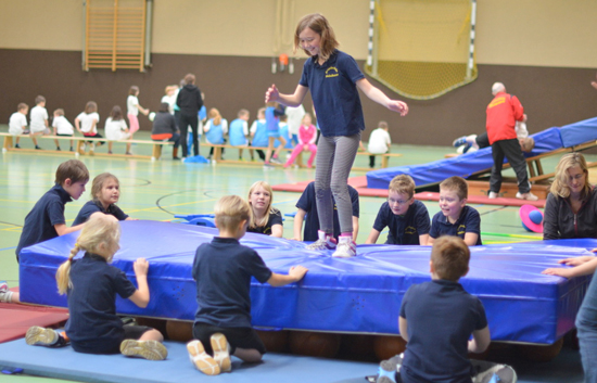 Für ein abwechslungsreiches Programm war gesorgt. Und alle Schüler hatten mächtig Spaß. Mit Begeisterung spielten die Kinder Minihandball, hüpften auf der Hüpfburg, spielten Rodeo auf der großen Weichbodenmatte und hatten Spaß bei der Rollbrettstaffel. Beim freien Spiel wurden die zahlreichen Spielangebote genutzt: Rollen von der schiefen Ebene, Rollbrettfahren durch einen Tunnel, jonglieren mit Tüchern. Außerdem standen Hüpfbälle, Stelzen, Moonhopper und Balancierschalen zur Verfügung und wurden mit Begeisterung benutzt.