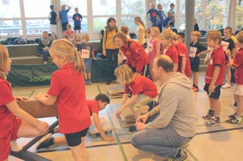 Lautstark wurden die Klassenkameraden bei der Rollbrettstaffel angefeuert. Beim Minihandball waren alle Kinder mit Begeisterung dabei.