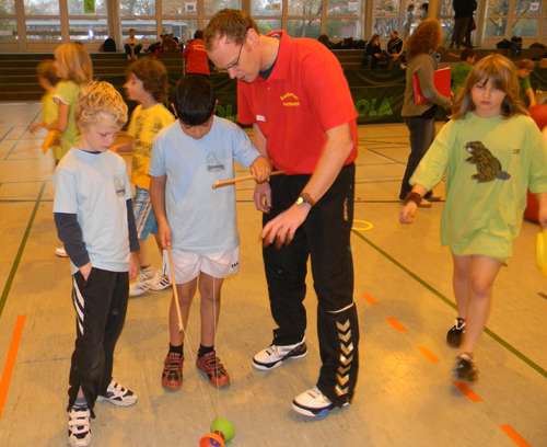 „Das besondere am Spielfest ist der Spielecharakter, der Spaß am Sport und in der Bewegung. Das drückt sich auch dadurch aus, dass der Handball nicht nur im Vordergrund steht, sondern auch die Koordinationsabläufe (siehe hierzu Kommentar) geschult werden. Beeindruckt bin ich auch von der schrägen Ebene, die viele Kinder noch nicht gesehen haben.“ (Siehe hierzu Bild)