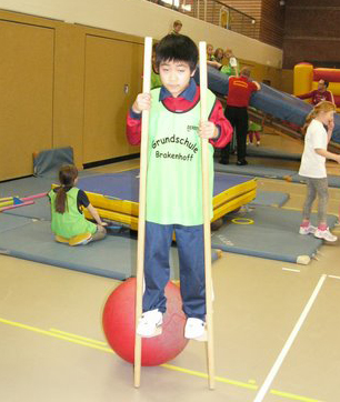 Und alle Schüler hatten mächtig Spaß. Mit Begeisterung spielten die Kinder Minihandball, hüpften auf der Hüpfburg, spielten Rodeo auf der großen Weichbodenmatte und hatten Spaß bei der Rollbrettstaffel. Beim freien Spiel wurden die zahlreichen Spielangebote genutzt: Rollen von der schiefen Ebene, Rollbrettfahren durch einen Tunnel, jonglieren mit Tüchern. Außerdem standen Hüpfbälle, Stelzen, Moonhopper und Balancierschalen zur Verfügung und wurden mit Begeisterung benutzt. Zwischendurch konnten sich alle mit einem Stück Kuchen, den Mütter der Brakenhoffschule gebacken hatten und verteilten, sowie Getränken stärken.